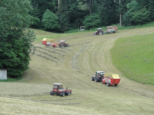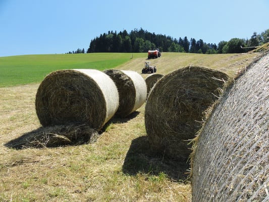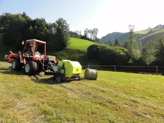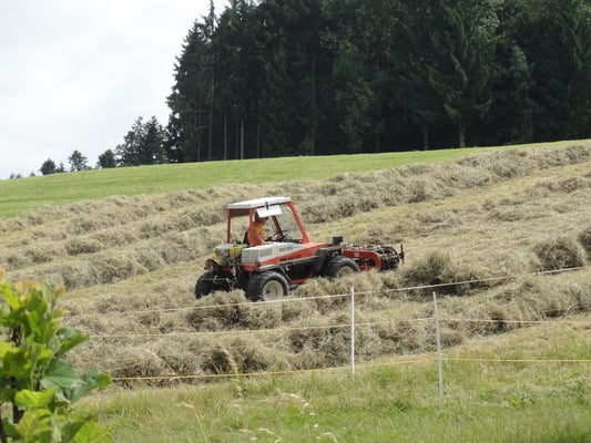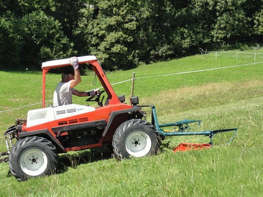 Zum schonenden schneiden des Grases verwenden wir ein Busatis Mähwerk, welches die kleinen Lebewesen in den Wiesen nicht einfach zerfetzt und wir verwenden nach Möglichkeit (je nach Wetterverhältnissen) auch kein nachlaufendes Schlegelwerk, welches die Halme zerquetscht damit sie schneller abtrocknen.