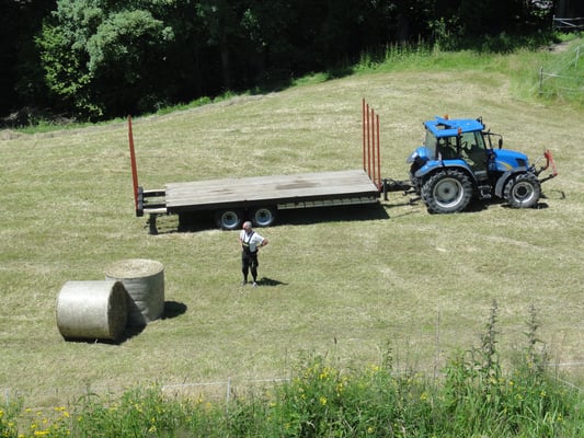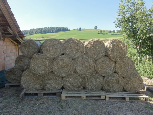 Wie wir aus eigener Erfahrung wissen, fehlen vielen Pferdehalter oder Hobby Kleintierhalter die nötigen Maschinen um grosse Ballen zu bewegen, abzuladen oder zu Lagern. Darum haben wir uns eine Kleinballenpresse angeschafft, mit zusätzlichem Wickler für Heylage. Die kleinen „herzigen“ Rundballen aus Heu, wiegen um die 15 – 20 kg und sind ausgezeichnet zu handhaben. Das Gewicht der Heylage Ballen bewegt sich um die 30 – 40 kg. Da wir auch eine alte Lanker Heurüstmaschine unser eigen nennen, besteht die Möglichkeit, das Heu gegen Aufpreis zu entstauben.