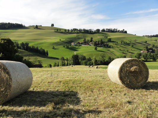 Gutes, gesundes und nachhaltiges Heu fängt schon bei der sorgfältigen Pflege der Wiesen an. Da wir Wiesen und Weiden übernommen haben, die von Placken und Hahnenfuss übersät waren – das gute Gras musste man suchen – konnten wir unseren Plan, diesen Hof als Bio Hof zu bewirtschaften fürs erste begraben. Uns wurde von einem Berater empfohlen, alles mit Ready Round Up (d.h. ein total Herbizid mit dem berüchtigten Wirkstoff Glyphosat) abzuspritzen und neu anzusäen, eine Bewilligung würde bei der Dichte an Placken sofort ausge-stellt. Und was kommt dann? Wohin verschwindet wohl das Gift? Und wie soll etwas Gesundes aus einem vergifteten Umfeld kommen? Wir haben uns dagegen entschieden. Aber Placken stechen bei dieser riesigen Fläche kam auch nicht in Frage. Wir haben uns auf eine Mittellösung geeinigt. Als erstes wurde die Bewirtschaftung geändert. Keine Gülle, kein Mist. Dem Gras wurde die Möglichkeit geboten vollständig abzusamen, den PH Wert haben wir mittels hochwertigem Algenkalk angehoben und Pflanzenkohle mit Kompost, den wir aus dem Mist unserer Pferde bereiten, verteilt. Auch unsere Feld - Spritze ist gekommen mit der wir in der Lage sind EM (effektive Mikroorganismen) auszubringen. Dazu wurden die Placken mit einem Mittel zur Einzelstock Bekämpfung abgespritzt und wir haben wochenweise Placken ausgeschnitten und ausgerissen, damit sie nicht noch weiter versamen können. Für die Menschen die keine Erfahrung in der Landwirtschaft haben. Placken sind grosse Pflanzen, die weite Flächen überwuchern, jede Pflanze hat um die 10 000 Samen und die überleben, je nach Quelle 20 bis 40 Jahre im Boden. Sie sind Zeigerpflanzen für überdüngte, übernutzte und verdichtete Böden.